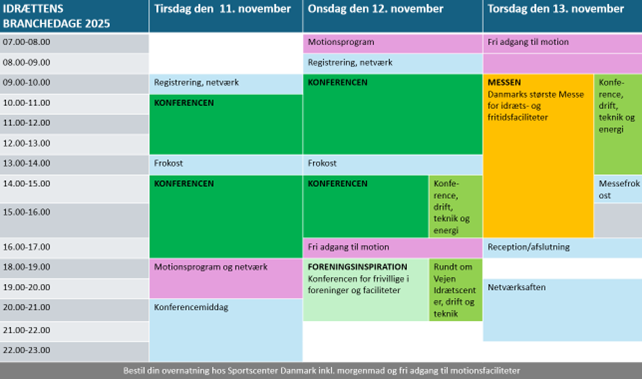 Her kan kan du se det samlede ‘flow’ af Konference, Messe og sociale aktiviteter under Idrættens Branchedage den 11.-13. november 2025.